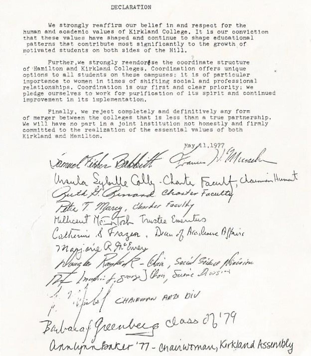 Until this point, many of us had no idea that there was a problem. Others had heard whispers of financial pressures, but it all seemed vague. Besides, as students, were were consumed by exams and plans for summer. Ironically, Kirkland was about to launch The Campaign for the Second Decade! So the meeting in which President Babbitt outlined the financial predicament Kirkland faced and the potential outcome if Hamilton did not agree to support the college financially was a gut punch. You could hears the gasps and see the worry and confusion etched on the faces of the men and women who attended the meeting. Students wondered, Should I transfer to another college? Fight back and save the college? Wait and hope for the best?
