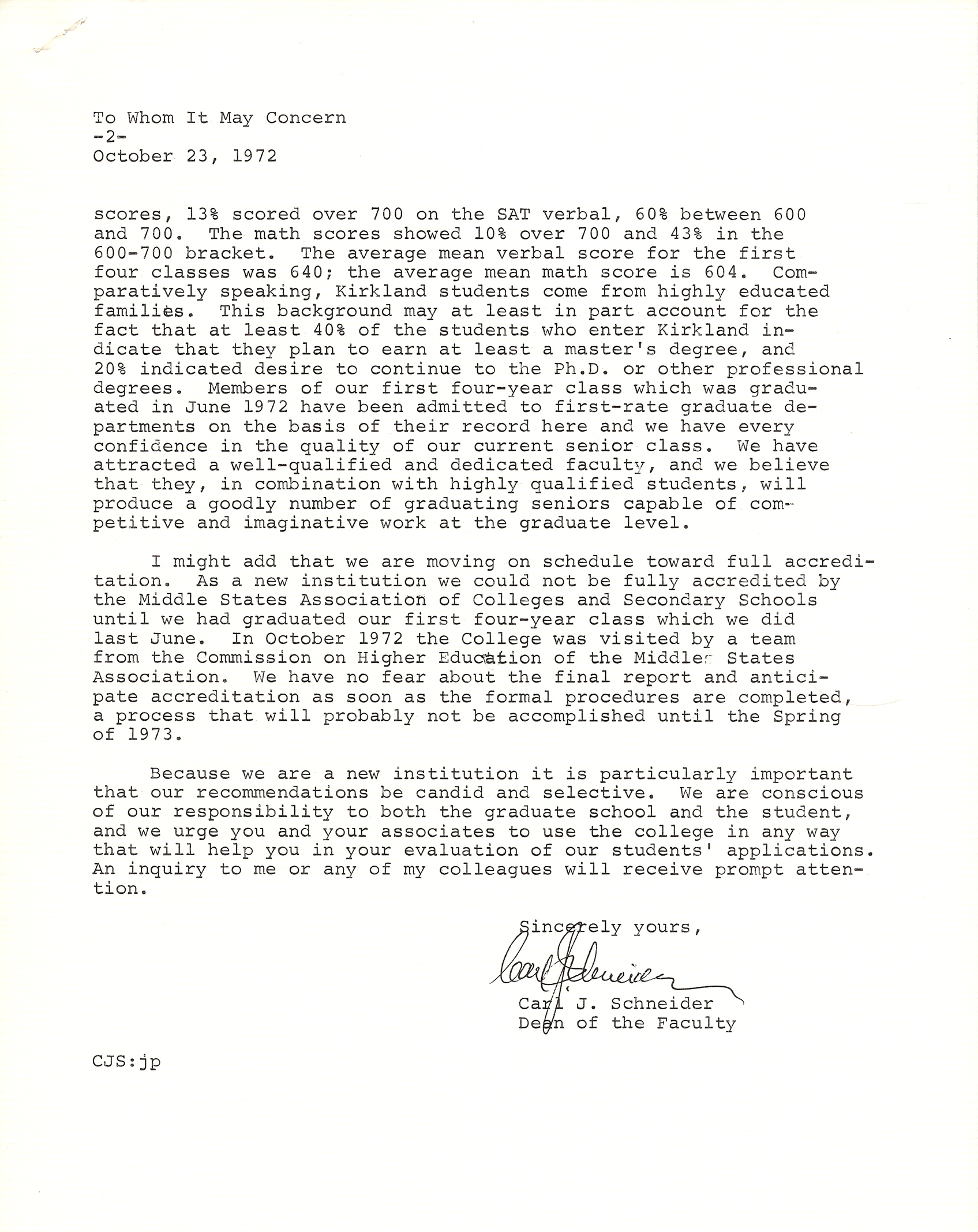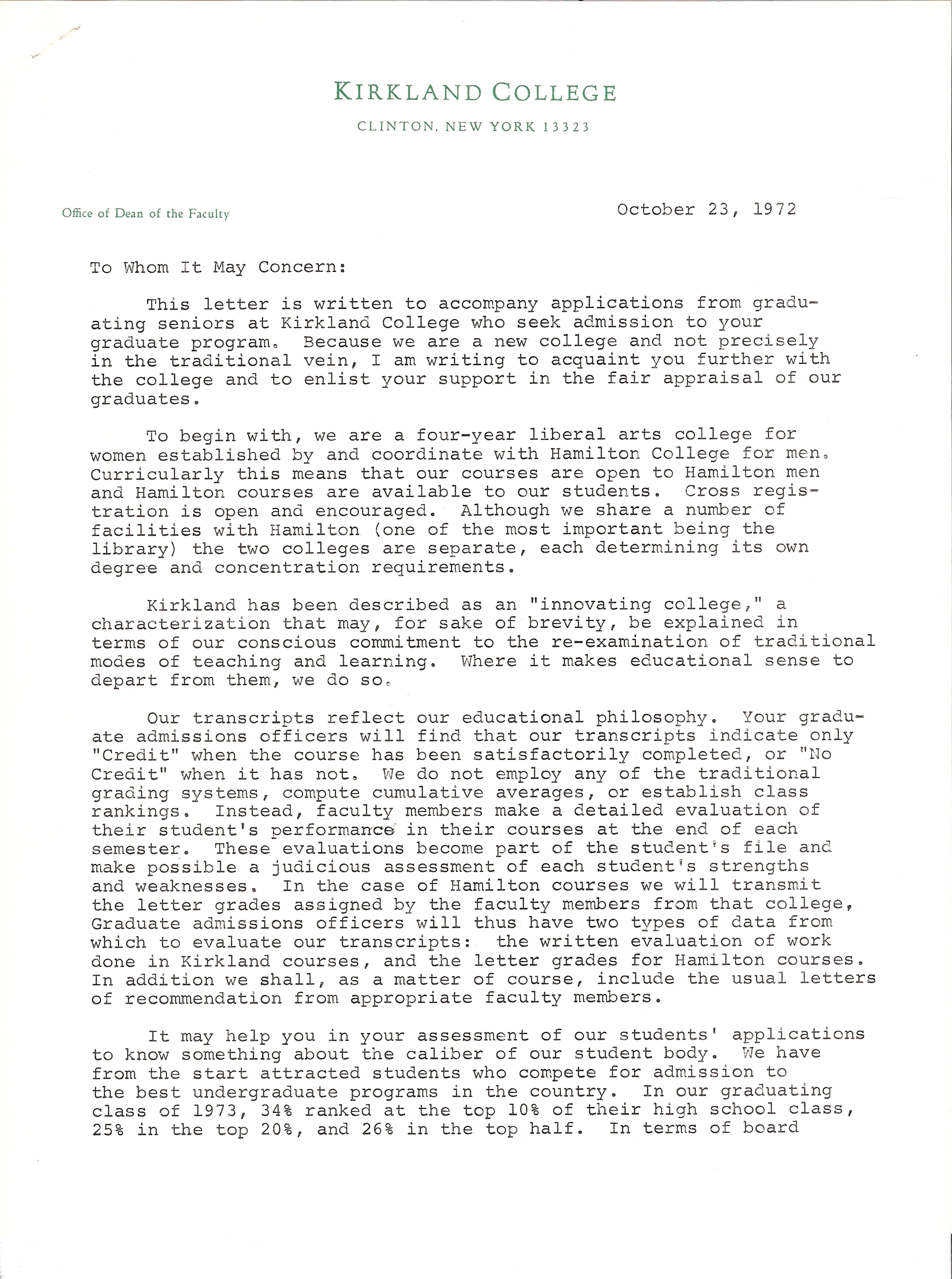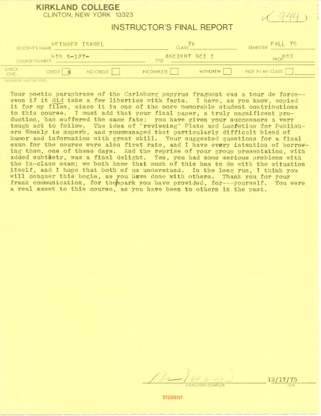 Most college students are familiar with traditional letter grades. Kirkland’s students, however, received typed narrative evaluations for each course or independent study.