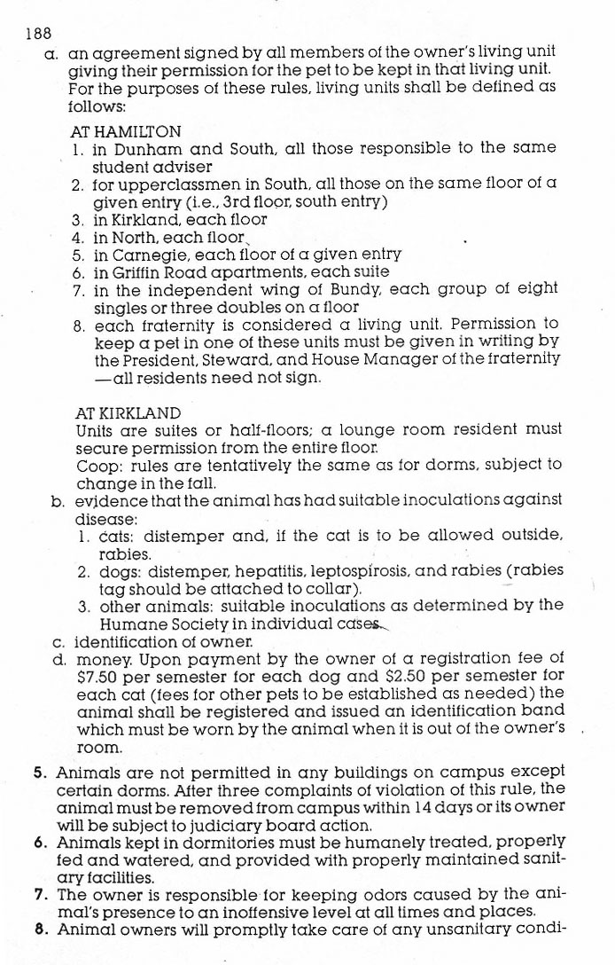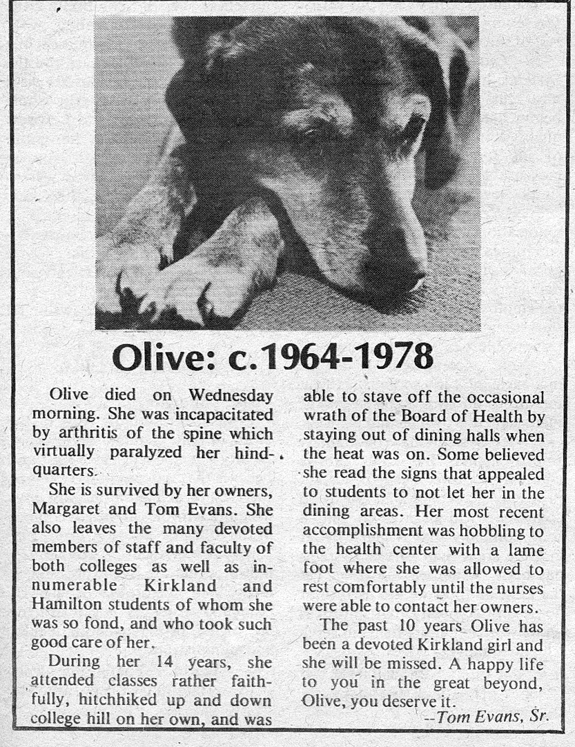 But back in the day, when Olive (c. 1964-1978) and Eeyore reigned supreme on the two campuses, animals were not only allowed but welcomed, although there were different rules for Hamilton and Kirkland students.  What was not to like about dogs like Olive, who hitchhiked, attended classes, slept in the dorms and never missed a meal in the dining halls?  And Eeyore, who lived in Chi Psi and was obsessed with rocks, and was darned good at Frisbee?