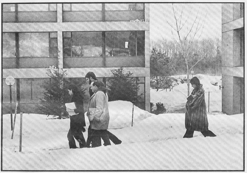I also remember playing in the snow and watching the campus dogs play in the snow,  traying down the hill behind Bristol Campus Center, and my glasses fogging up as I entered the Pub. Winter Study on campus was peaceful, yet intense. Many, if not most of us, had time to relax. Skiing, drinking (and toking), Hearts games and bed hopping were popular activities. But we also took advantage of the time to create and experience something new and exciting: a gothic arch, a performance, a useful item for one’s resume, a philosophy paper – as well as closer bonds with teachers and fellow students.