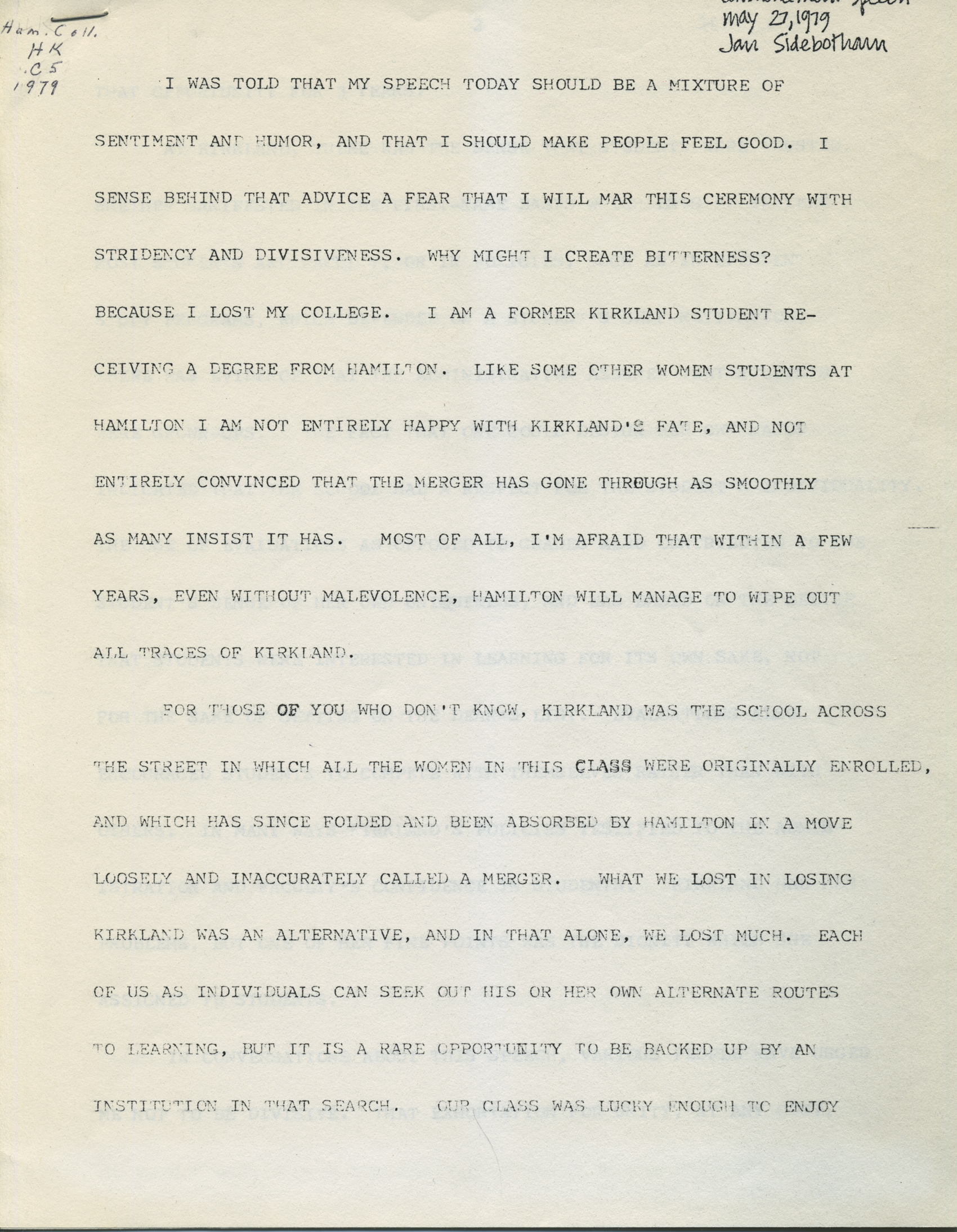 I was told that my speech today should be a mixture of sentiment and humor, and that I should make people feel good. I sense behind that advice a fear that I will mar this ceremony with stridency and divisiveness. Why might I create bitterness? Because I lost my college. I am a former Kirkland student receiving a degree from Hamilton. Like some other women students at Hamilton I am not entirely happy with Kirkland’s fate, and not entirely convinced that the merger has gone through smoothly as many insist it has. Most of all, I’m afraid that within a few years, even without malevolence, Hamilton will manage to wipe out all traces of Kirkland.