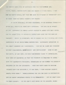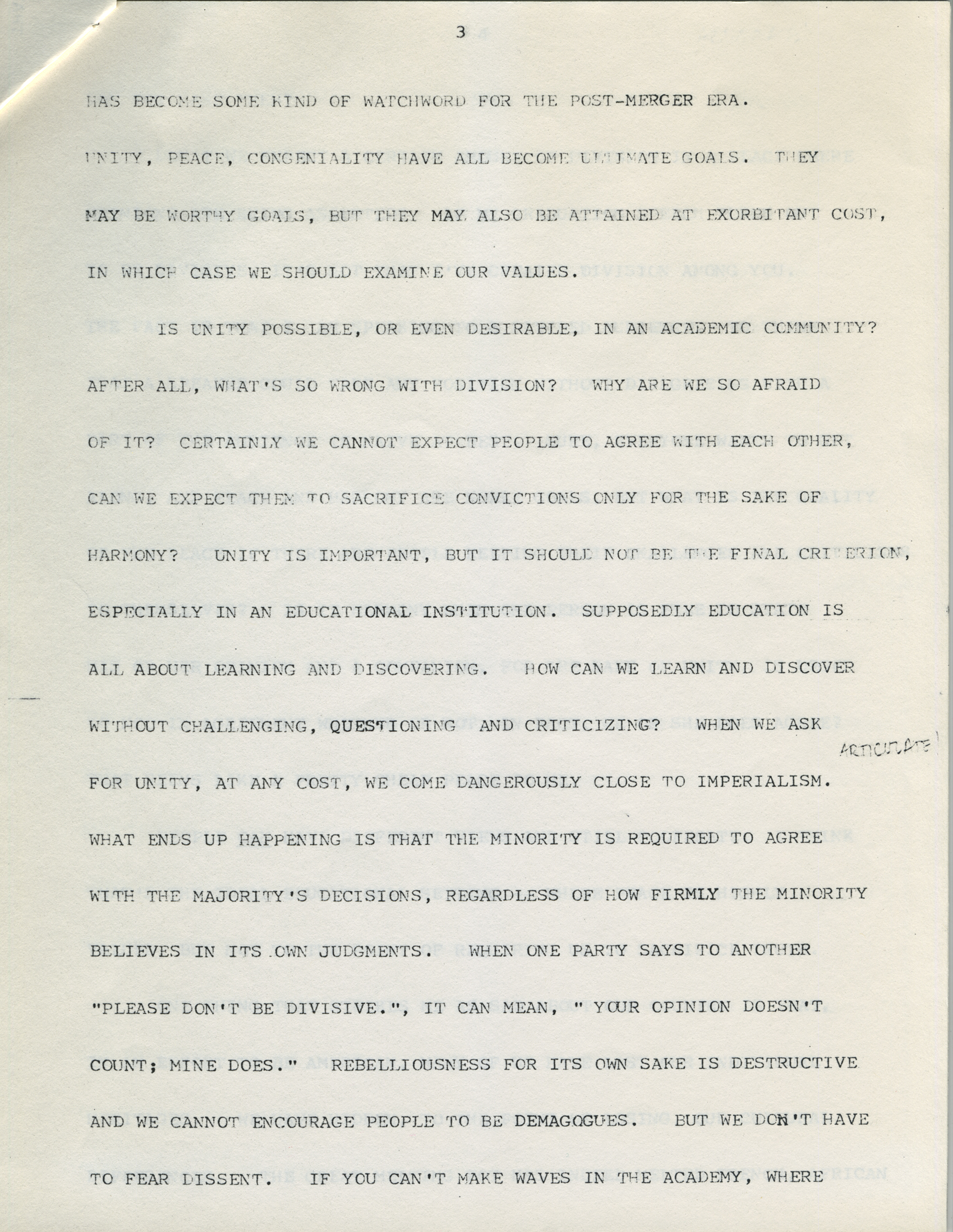 Is unity possible, or even desirable, in an academic community? After all, what’s so wrong with division? Why are we so afraid of it? Certainly we cannot expect people to agree with each other, can we expect them to sacrifice convictions only for the sake of harmony? Unity is important, but it should not be the final criterion, especially in an educational institution. Supposedly education is all about learning and discovering. How can we learn and discover without challenging, questioning and criticizing? When we ask for unity, at any cost, we come dangerously close to imperialism. What ends up happening is that the minority is required to agree with the majority’s decisions, regardless of how firmly the minority believes in its own judgments. When one party says to another “Please don’t be divisive.”, it can mean, “Your opinion doesn’t count; mine does.” Rebelliousness for its own sake is destructive and we cannot encourage people to be demagogues. But we don’t have to fear dissent. If you can’t make waves in the academy, where can you make them?