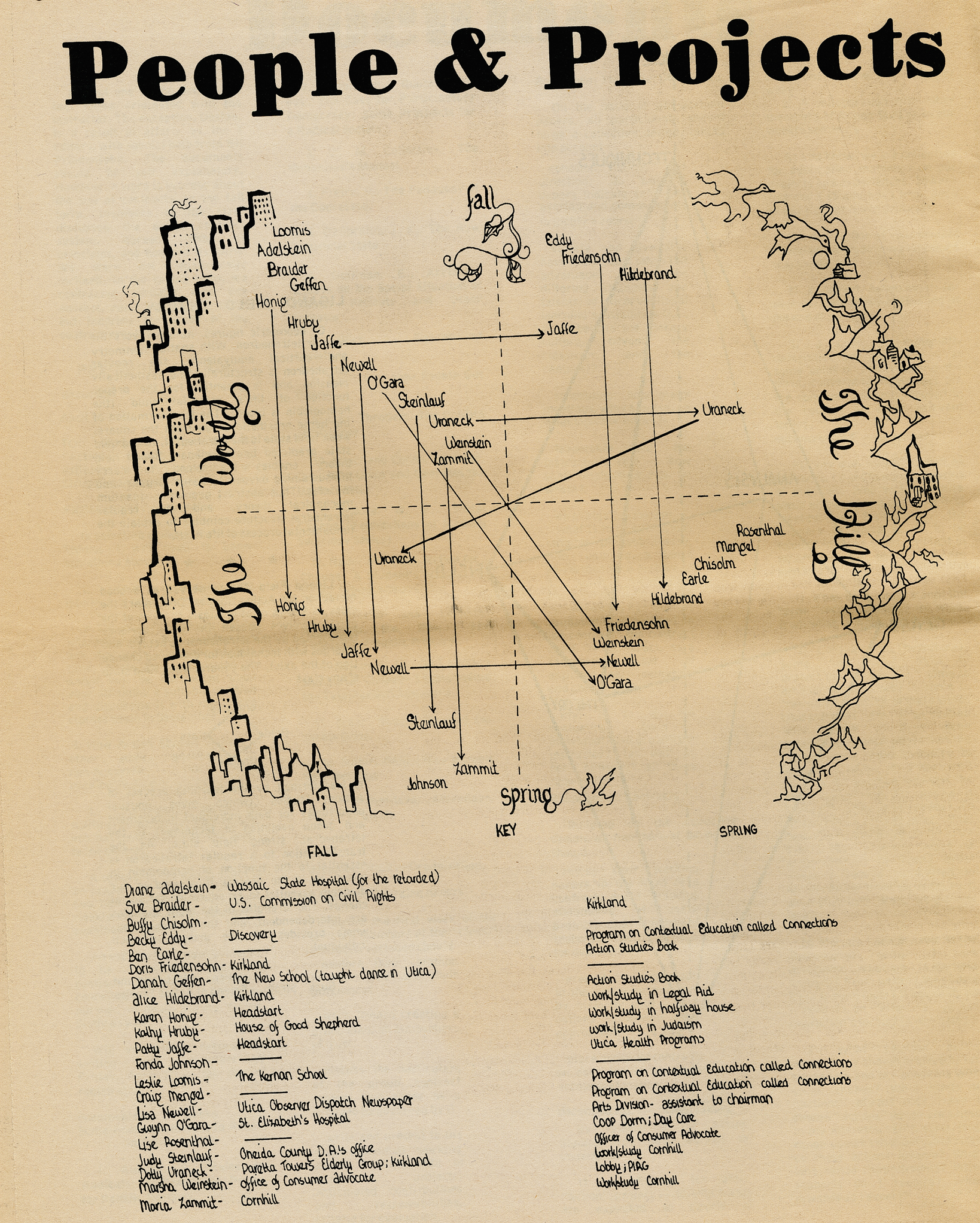 As a young faculty member and dean, I shared those good hopes, some of which were, of course, wishful thinking. Still, I valued that energized and positive way of thinking just as I valued Kirkland’s willingness to publish 242 in 1972 and a year later to publish another collaborative effort, Action Studies: American Attitudes and Values and the Struggle for Social Change, with Gwynne O’Gara (’73) and with illustrations once again by my husband Eli. This book revolved around students’ internships, which were a class requirement. The publication is a kind of conversation between the students and me on what it takes to make small changes in the world beyond ourselves.