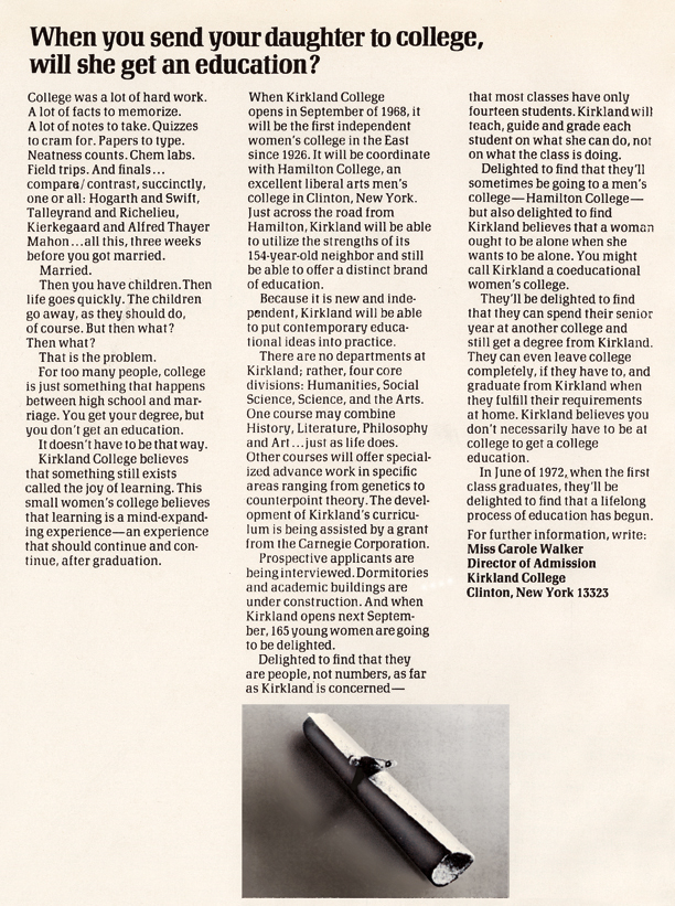 To help attract the charter class, the Kirkland Admission Office, directed by Carole Walker, took the unusual step of taking a full-page advertisement in the December 29, 1967, issue of Time magazine. “When you send your daughter to college,” the advertisement asked provocatively, “will she get an education?” At Kirkland, it promised, in language designed to resonate with its target audience in that year of Sgt. Pepper, education would be “a mind-expanding experience.”