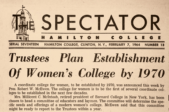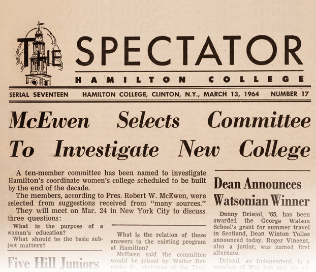 Not all Hamilton students were enthusiastic about the prospect of young women moving into the immediate neighborhood. The senior honorary society Pentagon condemned the idea out of hand, arguing that women in such close proximity would undermine Hamilton’s ability to groom “an intellectual elite” because “the possibility of social life in the middle of the week would distract many students from their studies.” The Spectator’s editors, on the other hand, thought it an idea worth trying. “Everyone is aware” of the social problems at Hamilton, they wrote in March 1963, “and has probably spent too much time discussing them. The important point is that the establishment of a coordinate women’s college would counteract many of the forces which create this abnormal life.”