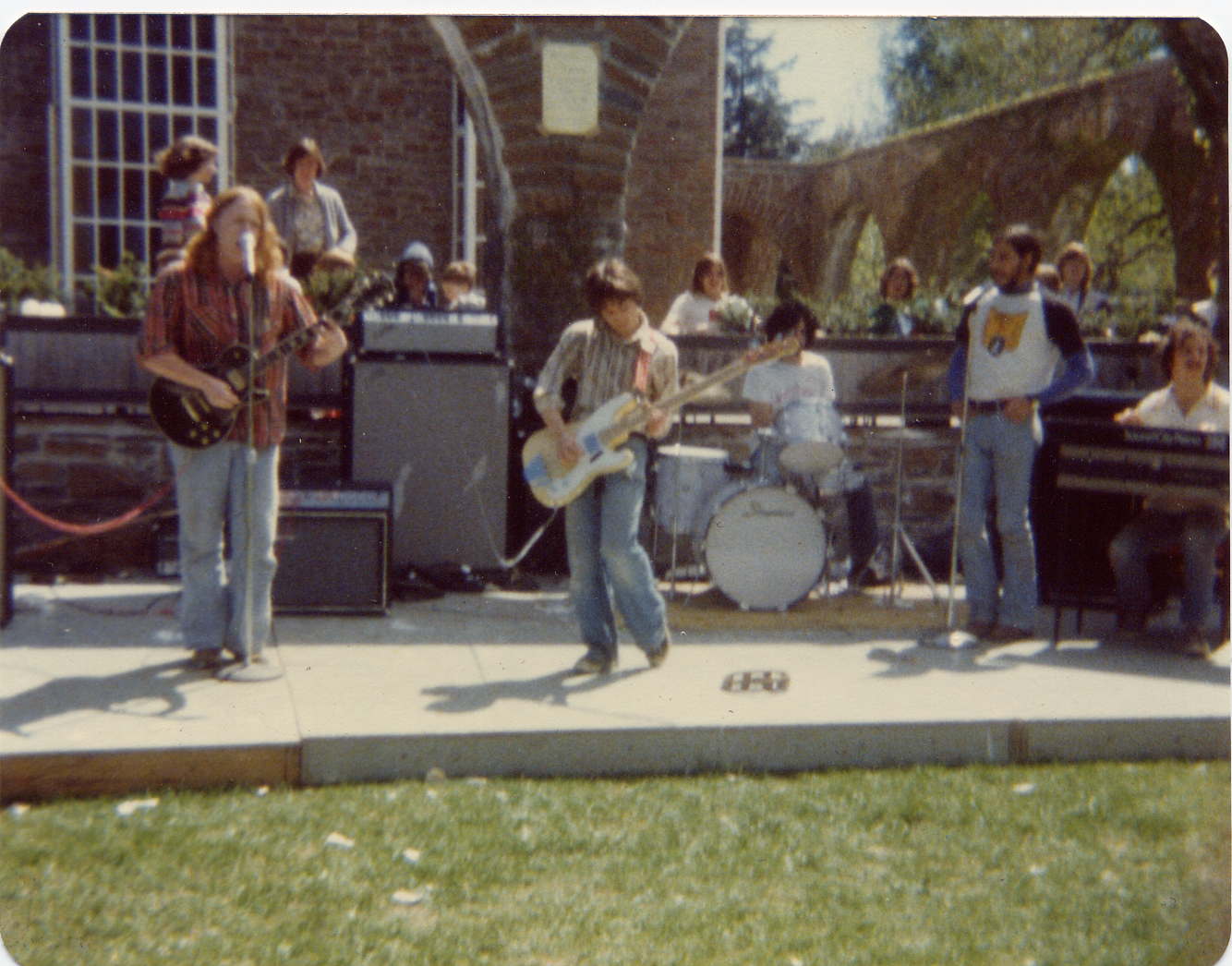 But our high water mark was our final show, the 1979 Commons Carnival. On a supernaturally lovely May afternoon, we set up at the south end of the central Hamilton quad. Rene had recently sustained a broken foot, and took the stage on crutches, but nothing could cripple the vibe of the day. Sporting freshly minted “Love a Rogue” T-shirts, we presided over an epic bacchanalia. Beer flowed freely, peasant skirts twirled gracefully, and Bob’s “Voice of the Theatre” speakers flung our sound all the way to Burke Library and back, until the final strains of “School’s Out” died in the late spring dusk.