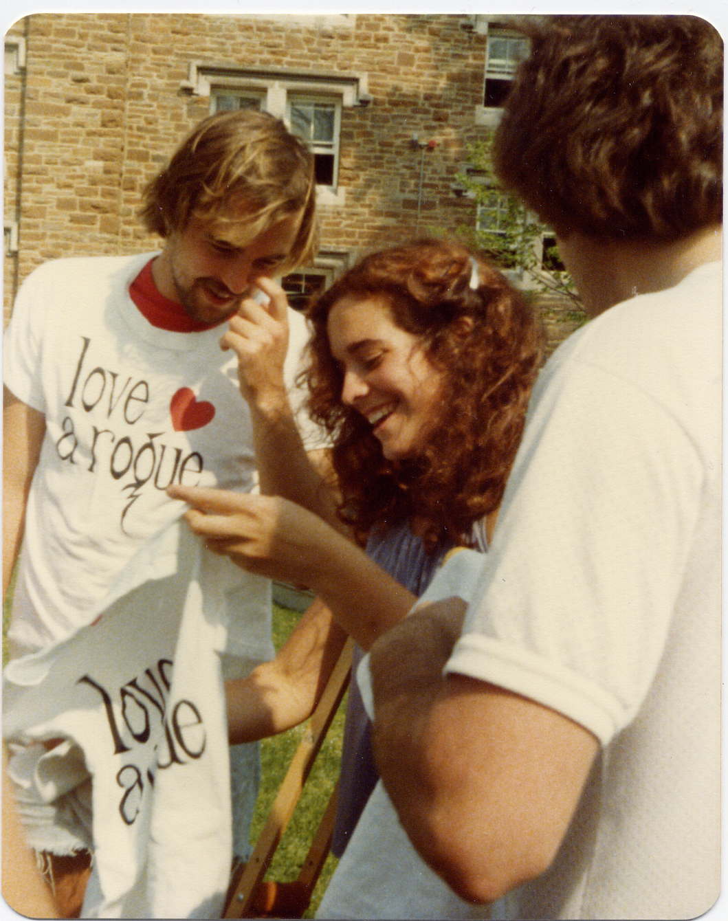 Rene Don presents Kevin Barry and her other bandmates with "Love a Rogue" T-shirts she had made for the group's farewell performance at Commons Carnival, 1979