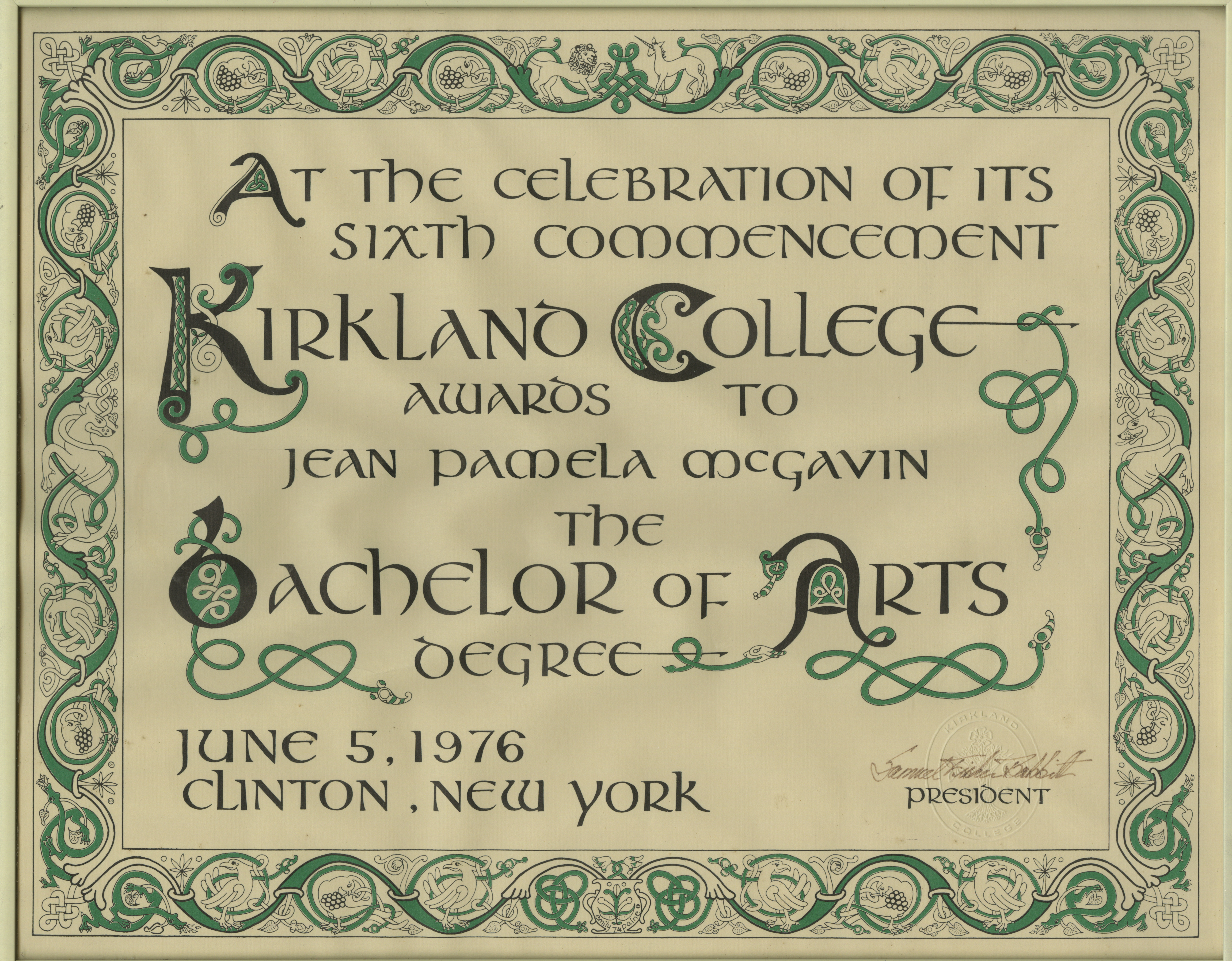 Kirkland College 1976 diploma of Jean McGavin