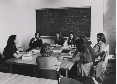 Tess Gallagher (bottom left) in a workshop with the following students facing the camera, left to right: Dan D’Amelio (H’79), Jo Pitkin (K’78), Susanne Marcus (K’78), and Kevin McDonough (H’78).